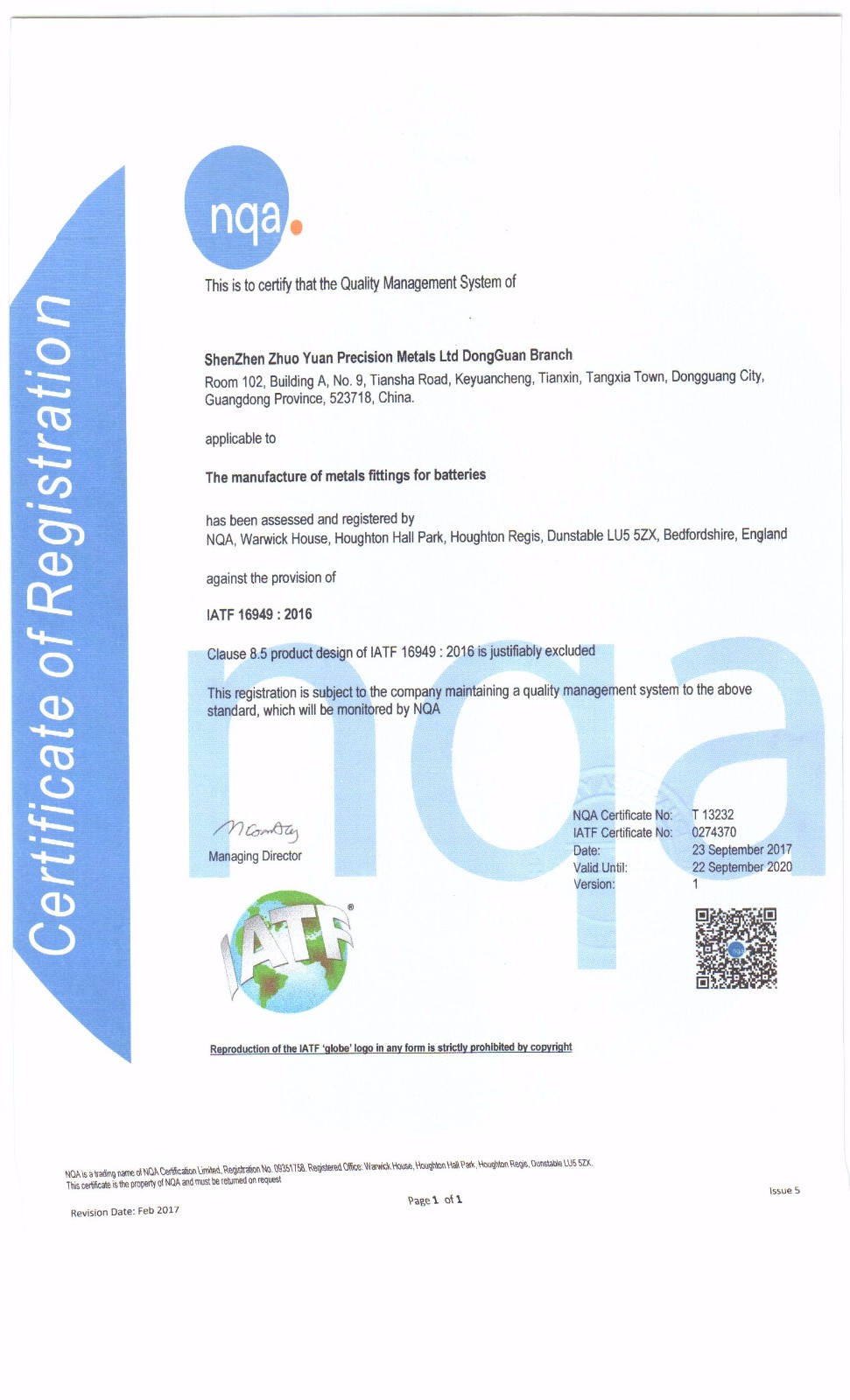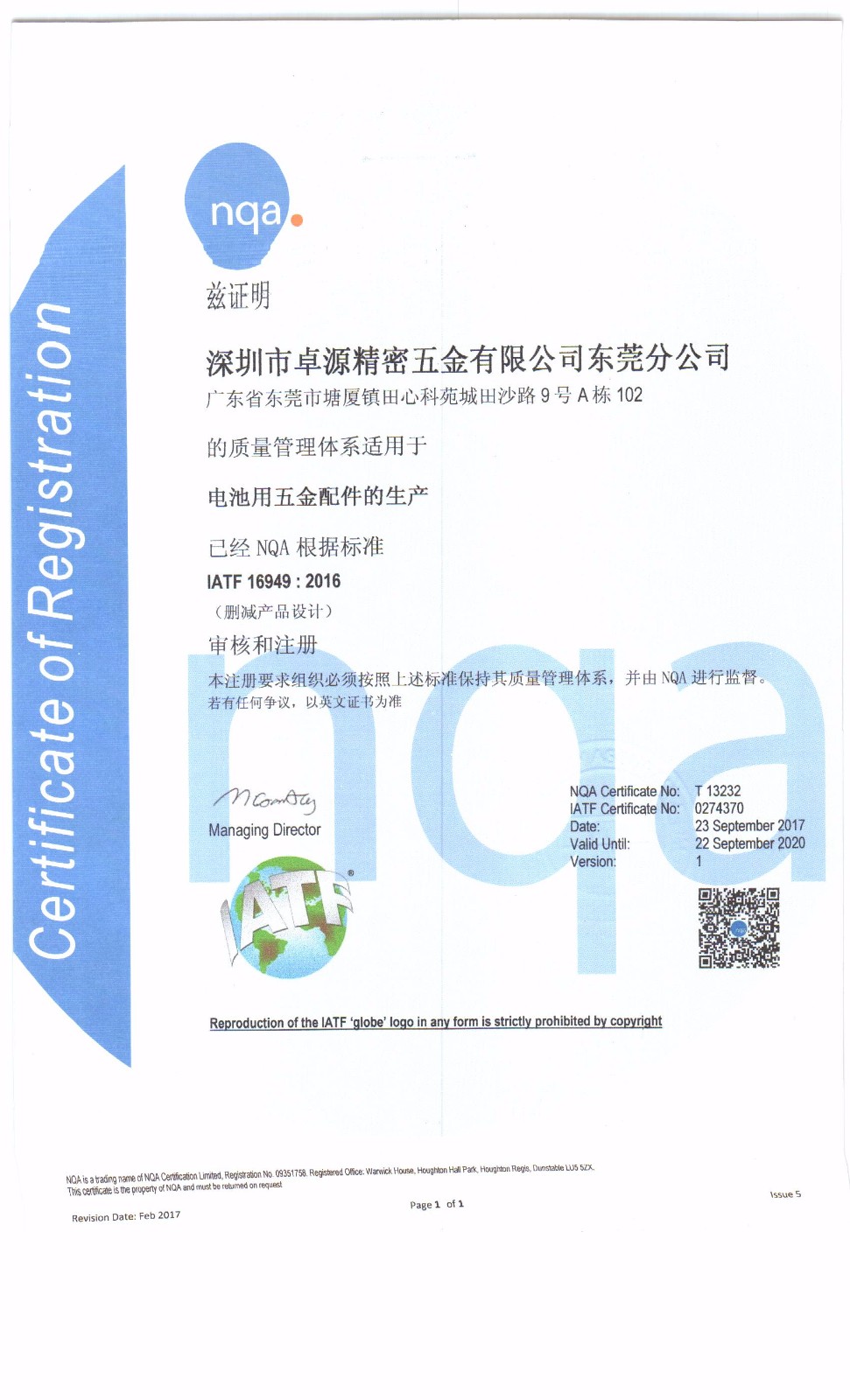 ISO 9001:2015/ IATF 16949:2016 質(zhì)量管理體系證書(shū)